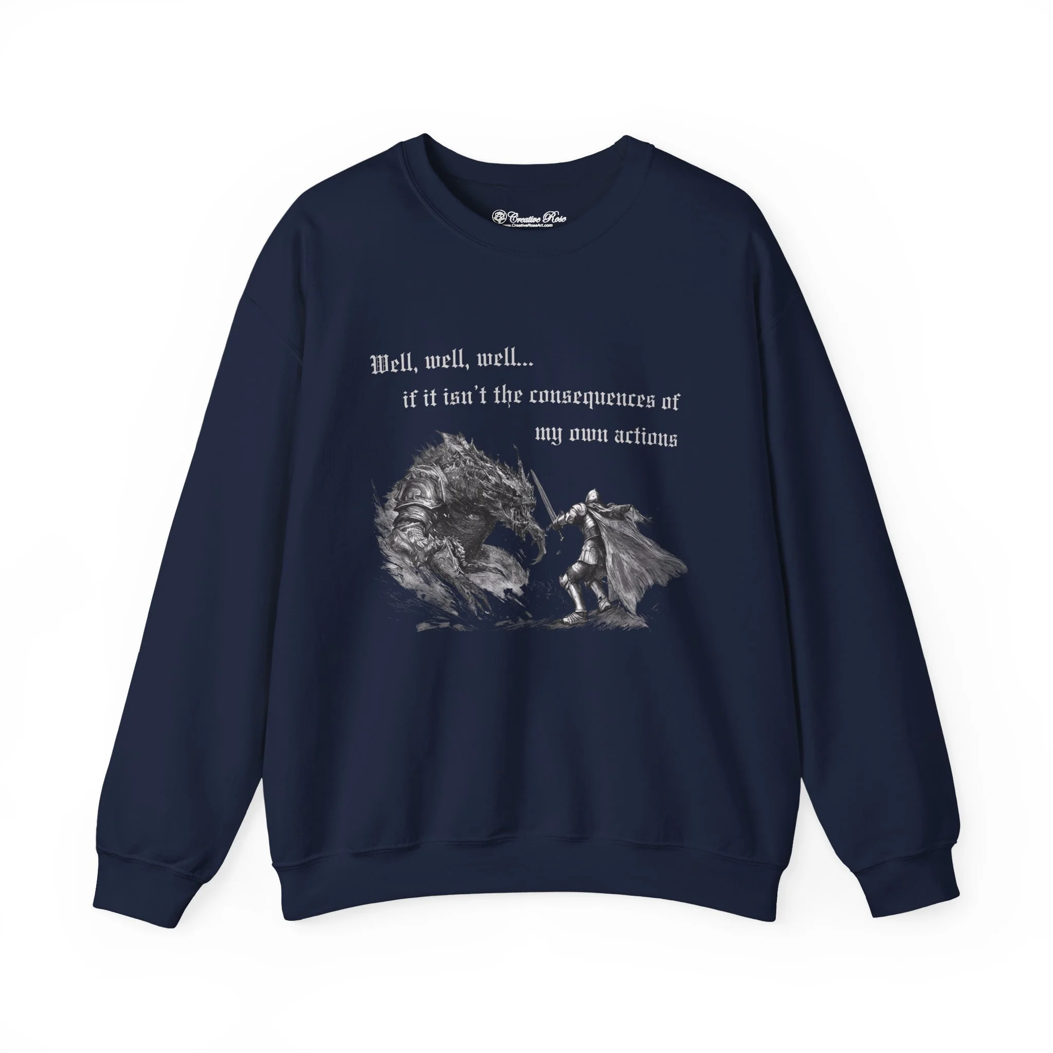 Is dark humor your defense mechanism? if so this chaotic soft, sturdy crewneck is for you. Featuring a dark, vintage-style illustration of a knight facing a hulking beast under the wry line: “Well, well, well... if it isn’t the consequences of my own actions”. The sweatshirt’s muted grayscale print gives a worn, storybook feel illustrating life’s many curveballs. It layers easily over tees or under a jacket on windy days. Wear it when you want to lean into sarcasm during study sessions, late-night gaming, or while sipping tea planning your next move.