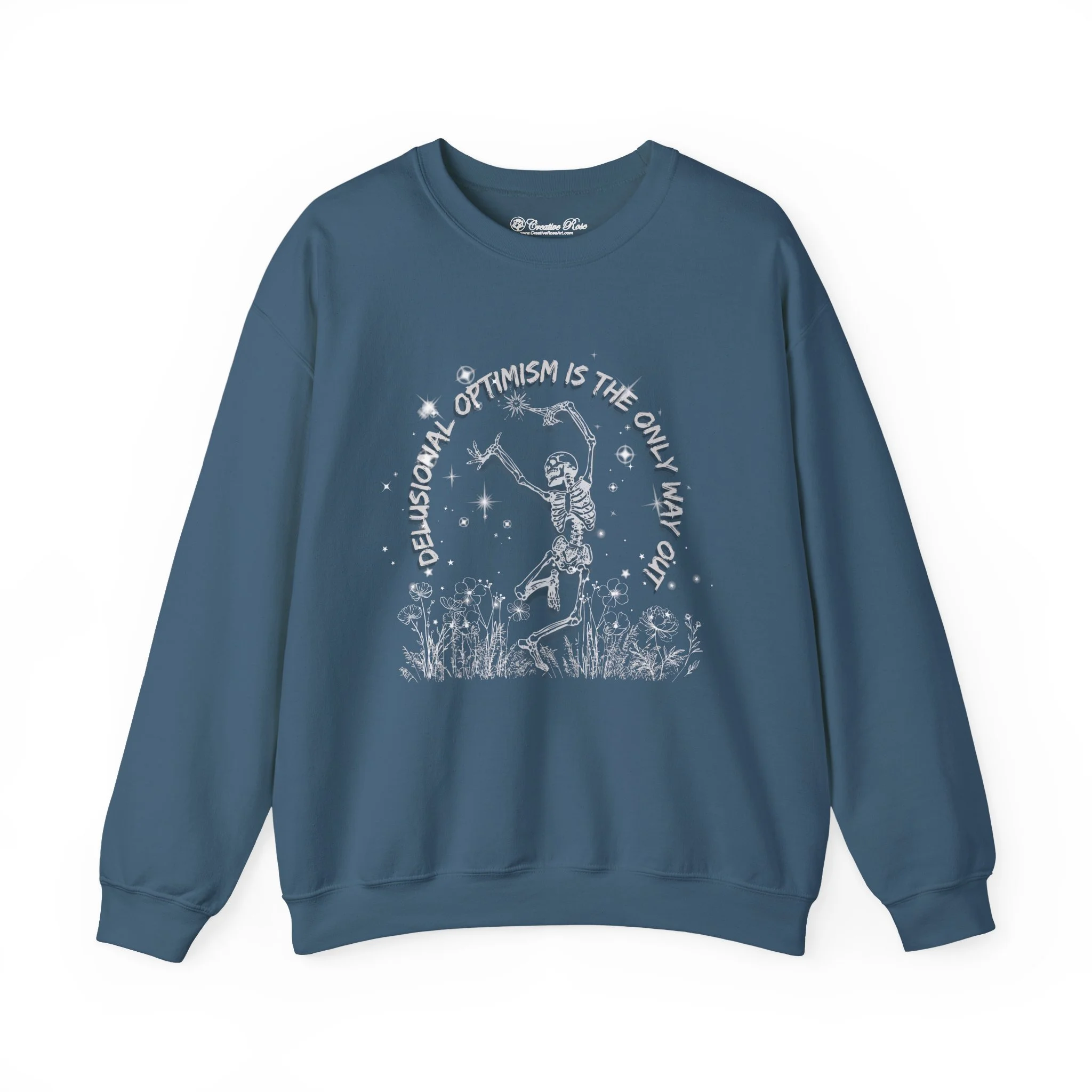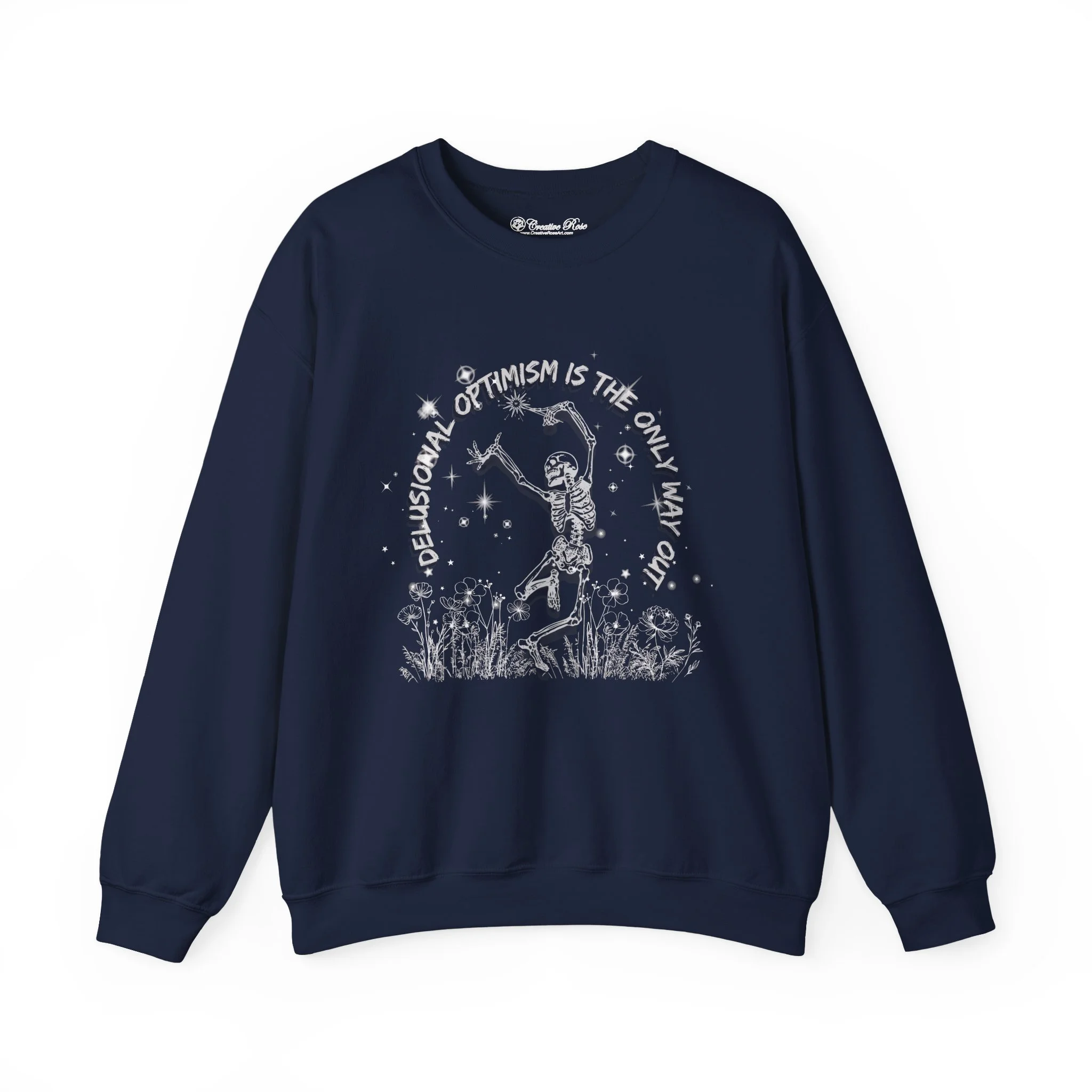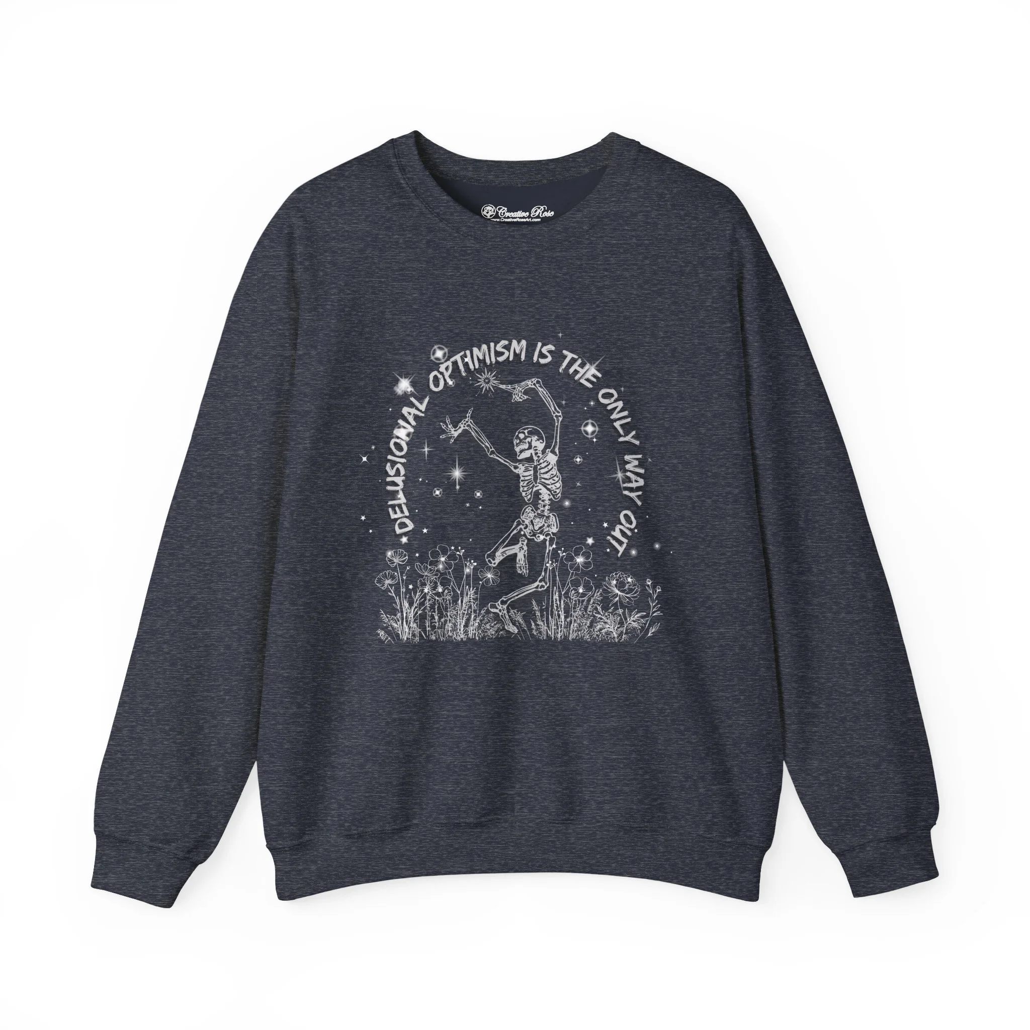 Crewneck Sweatshirt — "Optimism Is the Only Way Out" Skeleton Graphic