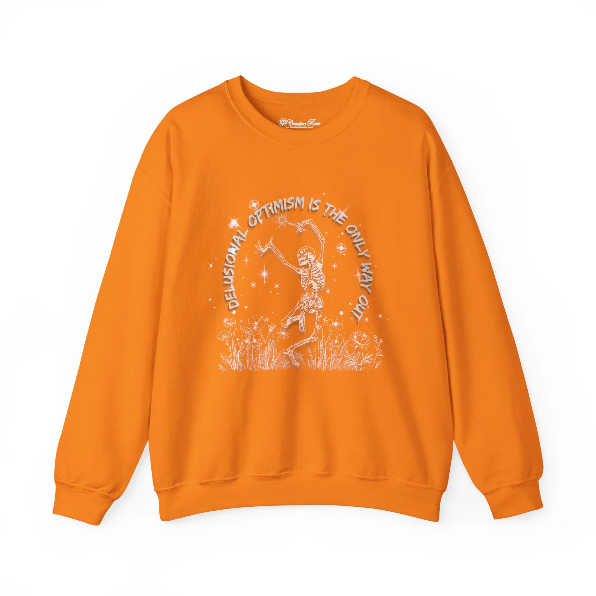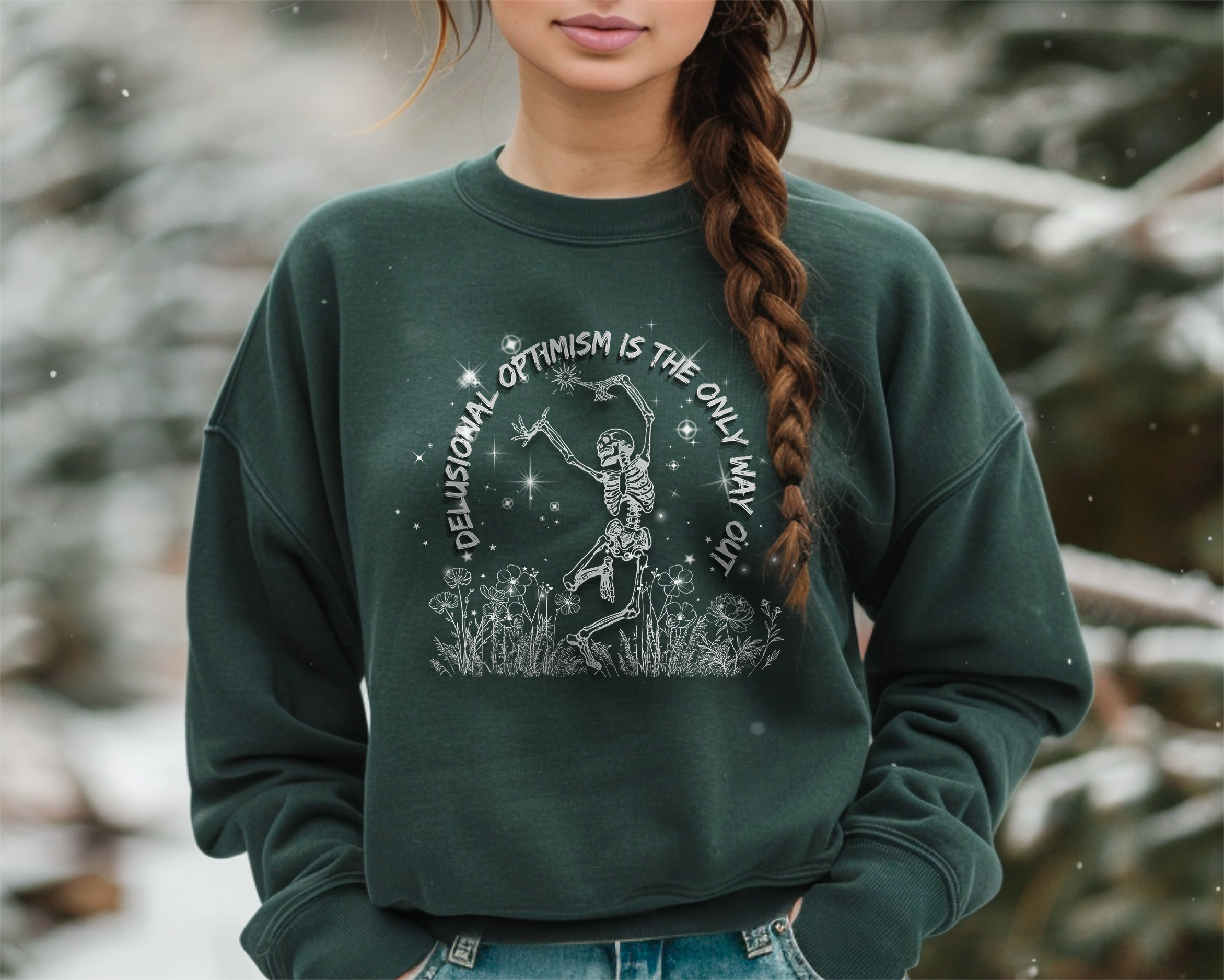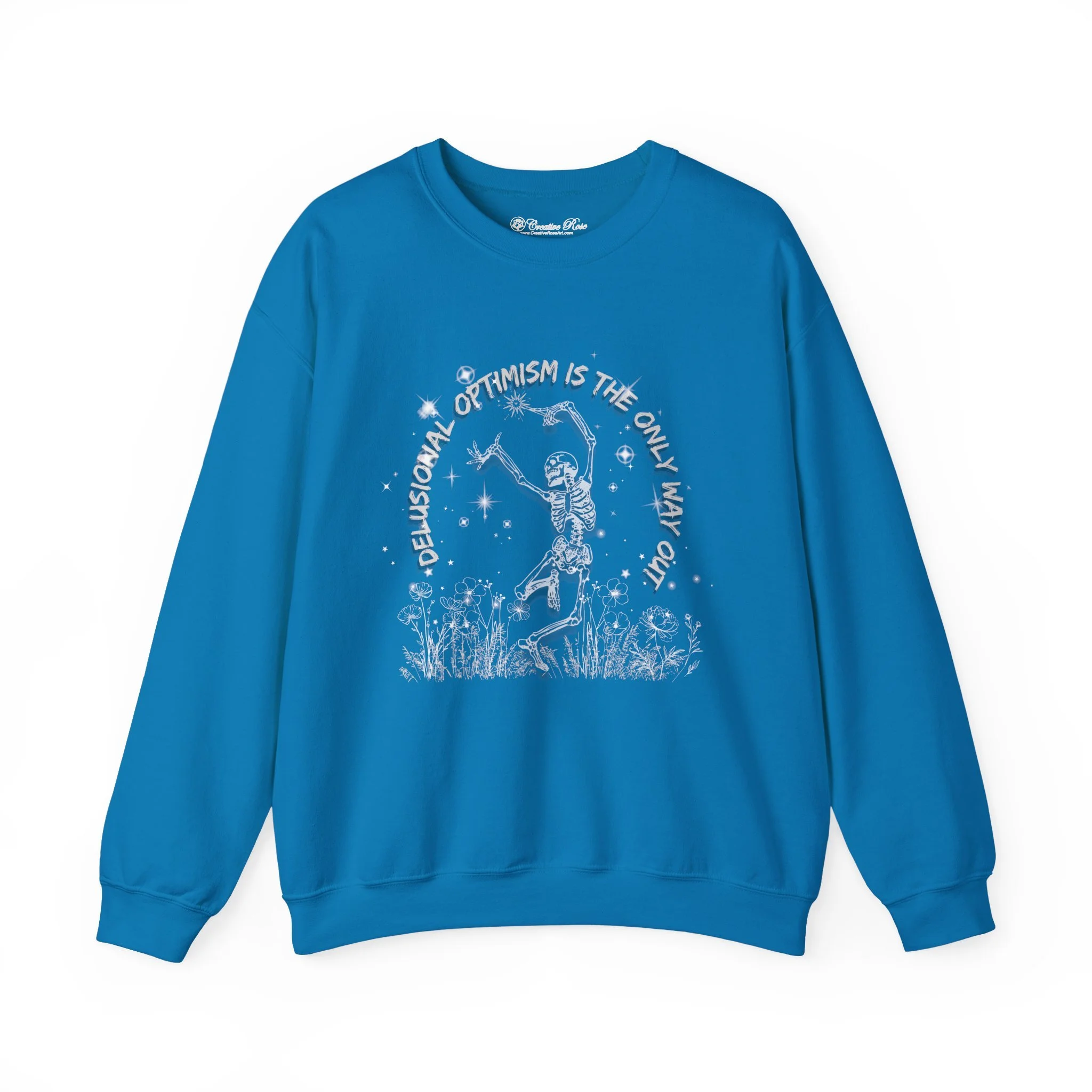 Crewneck Sweatshirt — "Optimism Is the Only Way Out" Skeleton Graphic