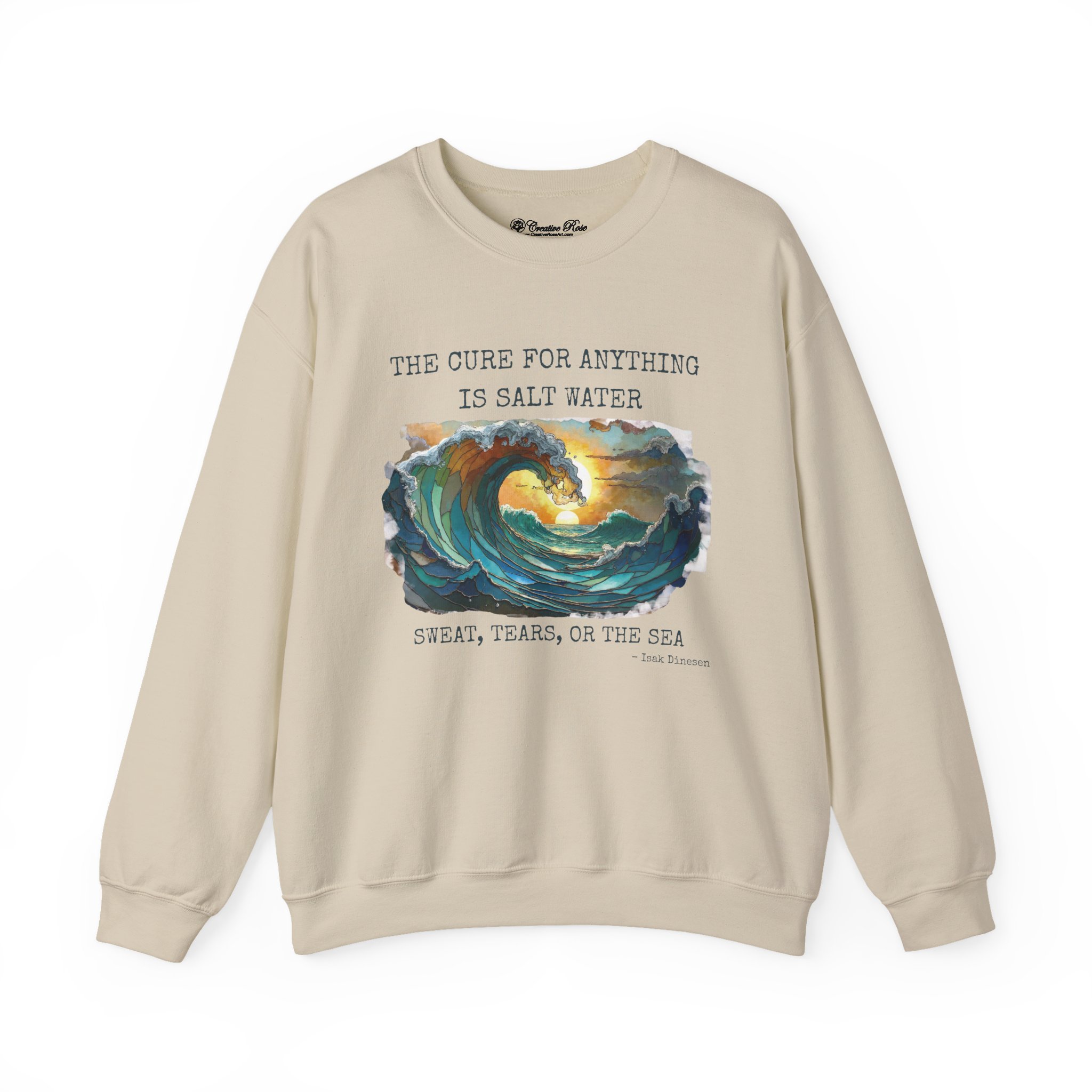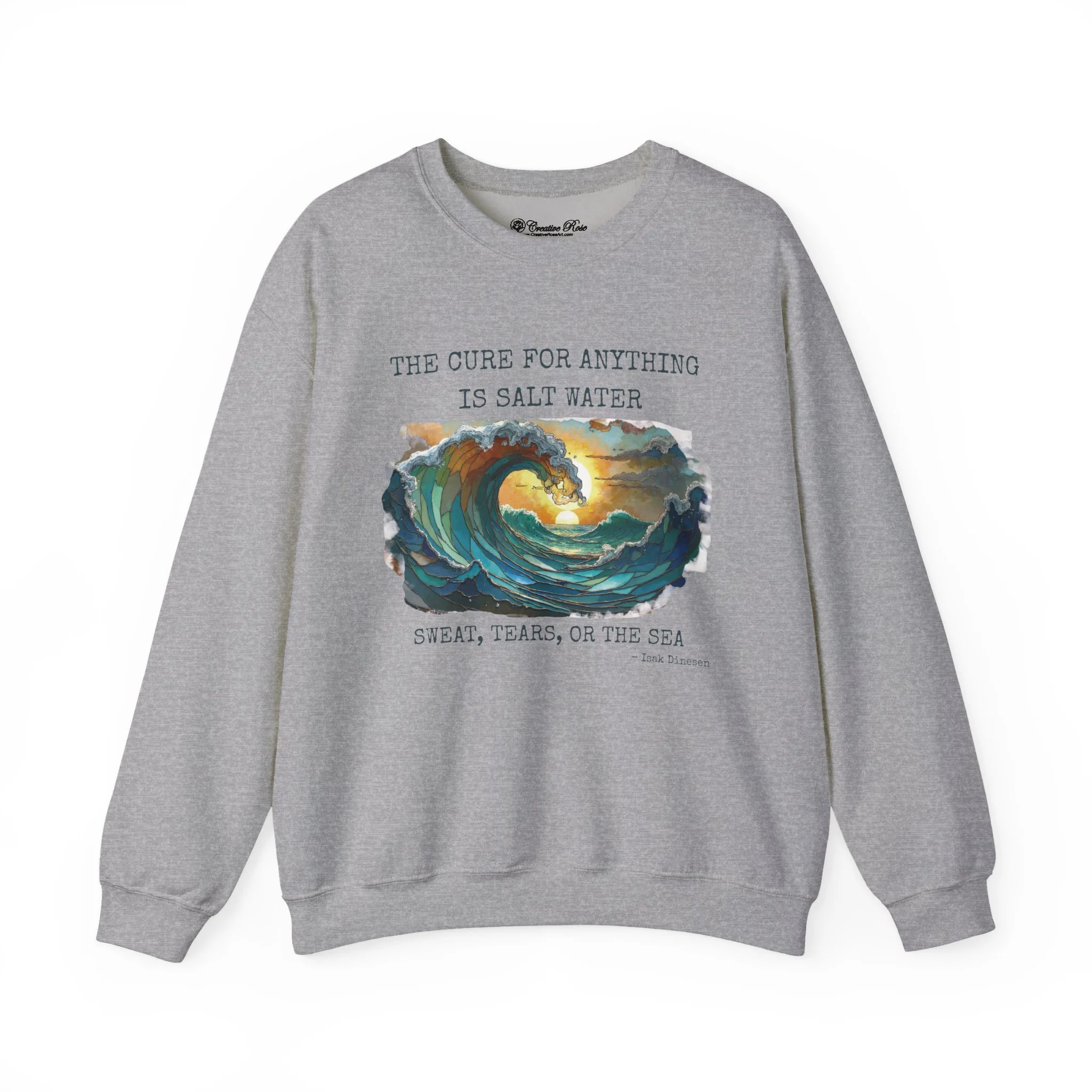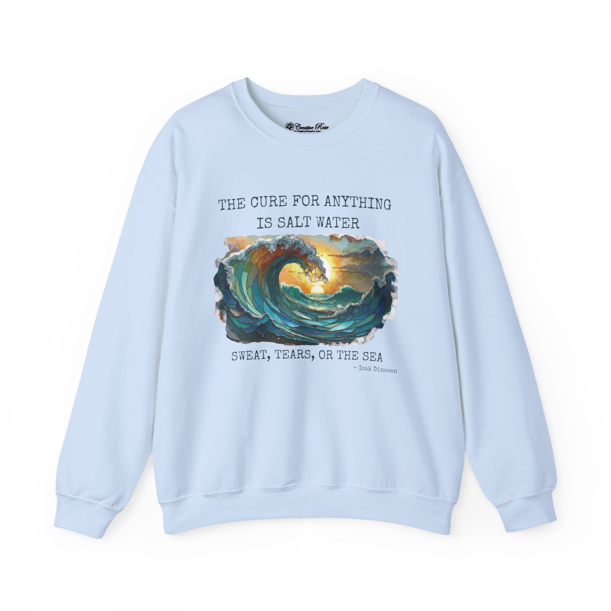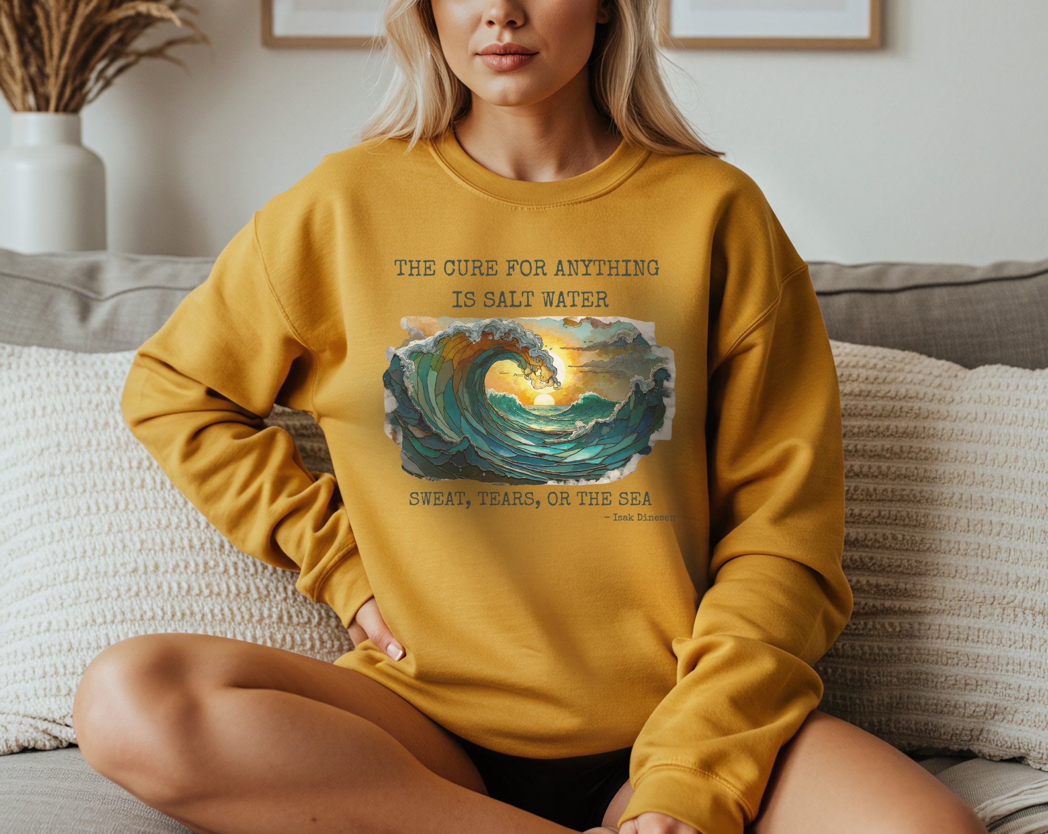 This cozy crewneck channels the restorative properties of salt water. Representing that life comes & goes in waves. “The cure for anything is salt water: sweat, tears, or the sea,” Reminds you that you have all the tools necessary to ride the waves and heal yourself in the process. The 50/50 cotton-poly blend and ribbed collar give it a lived-in comfort while the clean, classic silhouette keeps the look effortless. Wear it on foggy mornings, after a long swim, or curled up with a book — it’s made to feel like a soft embrace for anyone who finds clarity through salt water.