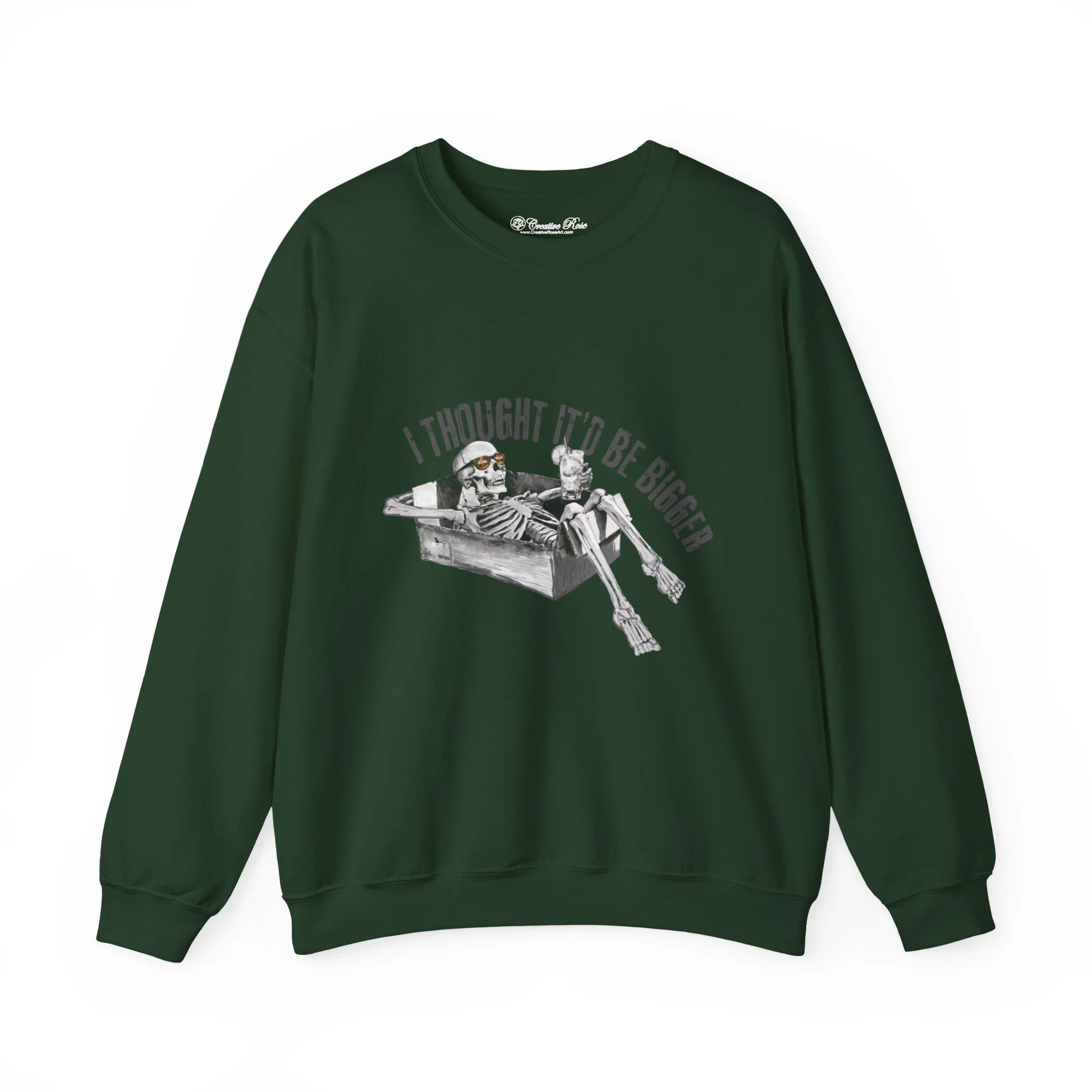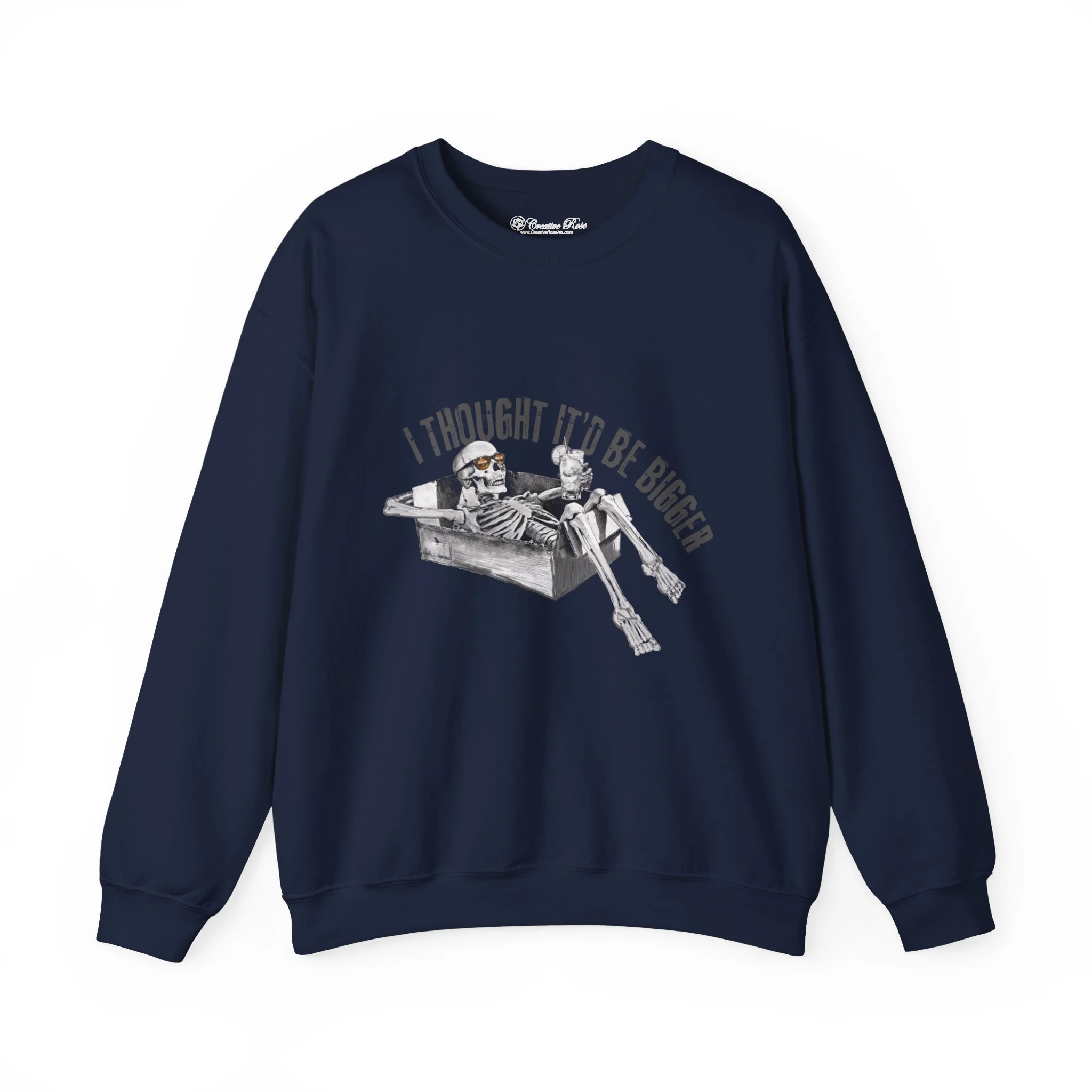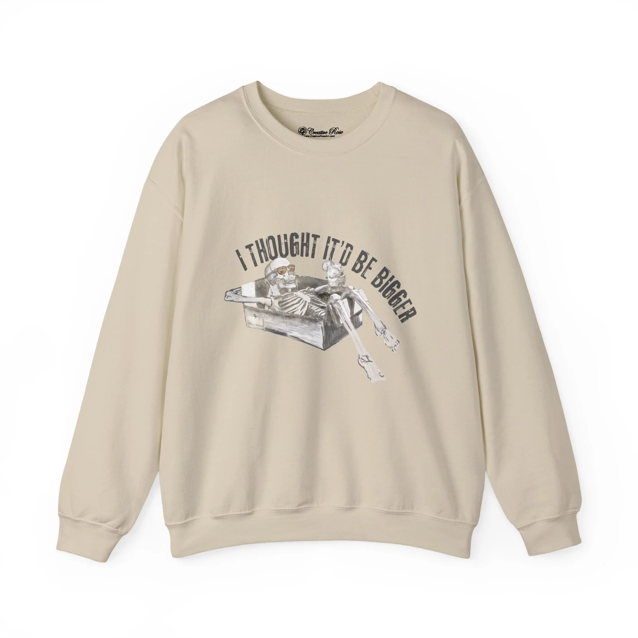 A soft, slightly oversized crewneck that carries a darkly humorous edge. Gen Z meets WW3 humor. The crewneck features a grayscale illustration of a relaxed skeleton lounging in a cardboard box sipping a drink as the world ends with the caption “I thought it’d be bigger” arched above. Wear it to bonfires, game nights, or on your daily stroll; it layers easily under a coat or over a favorite tee and keeps its shape thanks to ribbed collar and reinforced stitching. Ethically sourced US cotton and OEKO‑TEX dyes mean the piece looks good and feels responsibly made.