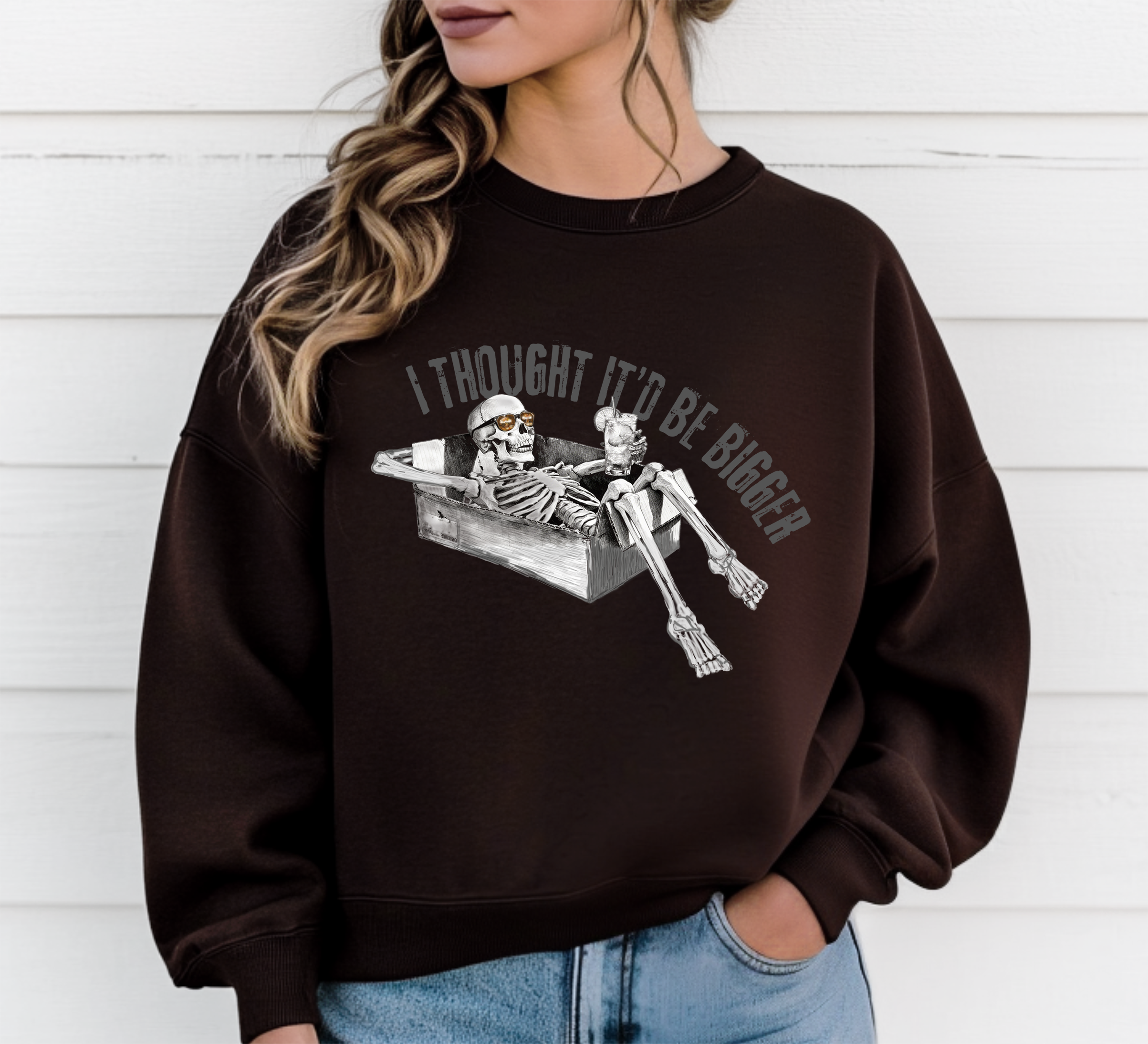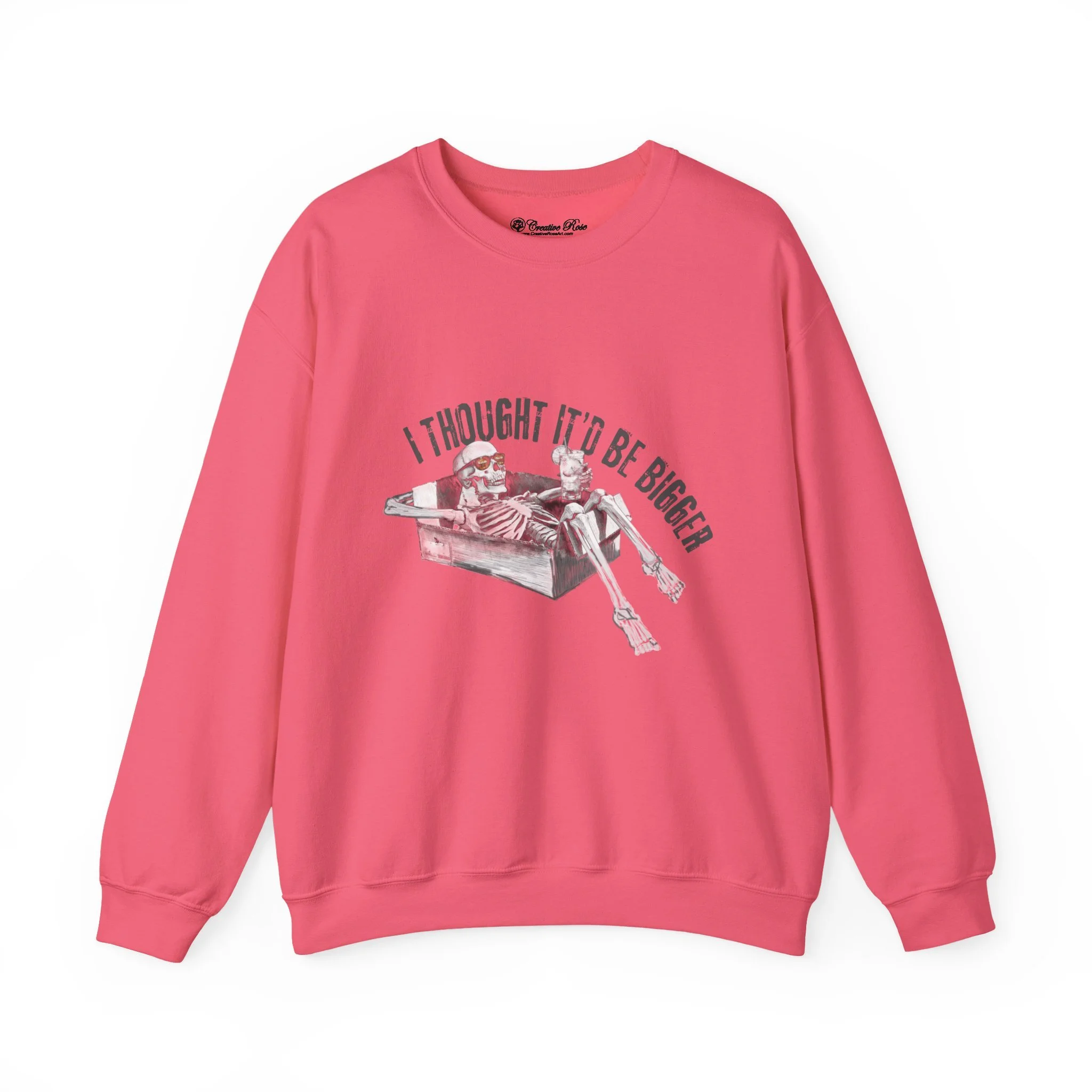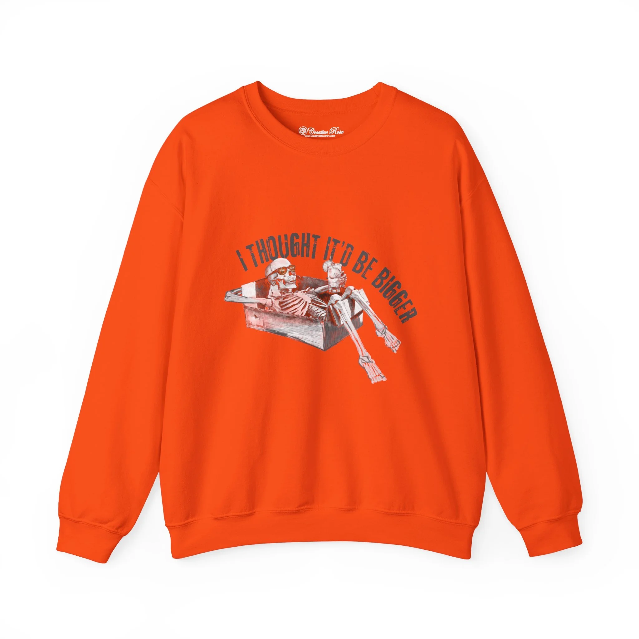 A soft, slightly oversized crewneck that carries a darkly humorous edge. Gen Z meets WW3 humor. The crewneck features a grayscale illustration of a relaxed skeleton lounging in a cardboard box sipping a drink as the world ends with the caption “I thought it’d be bigger” arched above. Wear it to bonfires, game nights, or on your daily stroll; it layers easily under a coat or over a favorite tee and keeps its shape thanks to ribbed collar and reinforced stitching. Ethically sourced US cotton and OEKO‑TEX dyes mean the piece looks good and feels responsibly made.